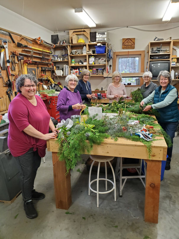 When I joined the Glacier Grannies in November 2013, the first project I got involved with was making swags. Lynn was the driving force behind this fundraiser, and she dedicated the lower level of her home (then near Vanier School) to greenery, ribbons and Christmas bling. She made me very welcome, and quickly and competently had me making swags which she stored ready for our sale.